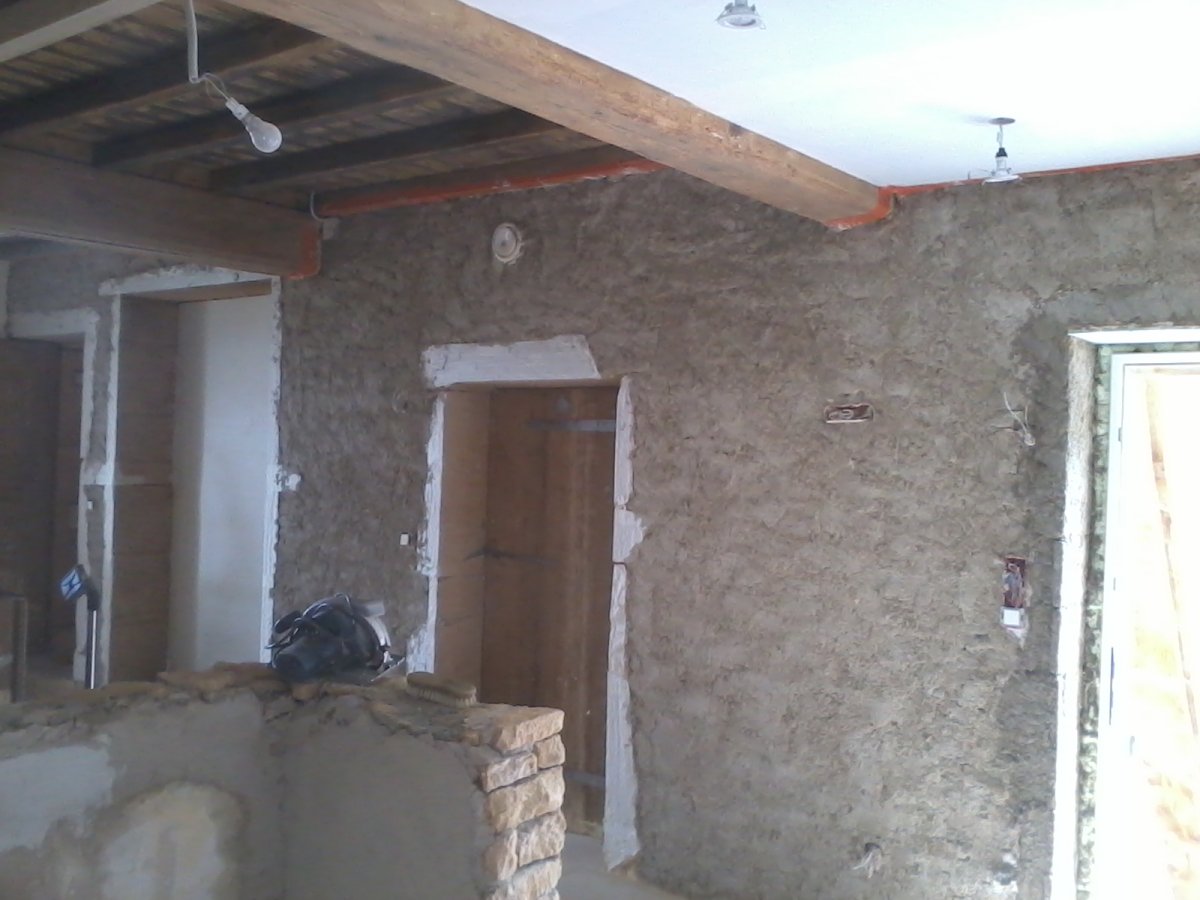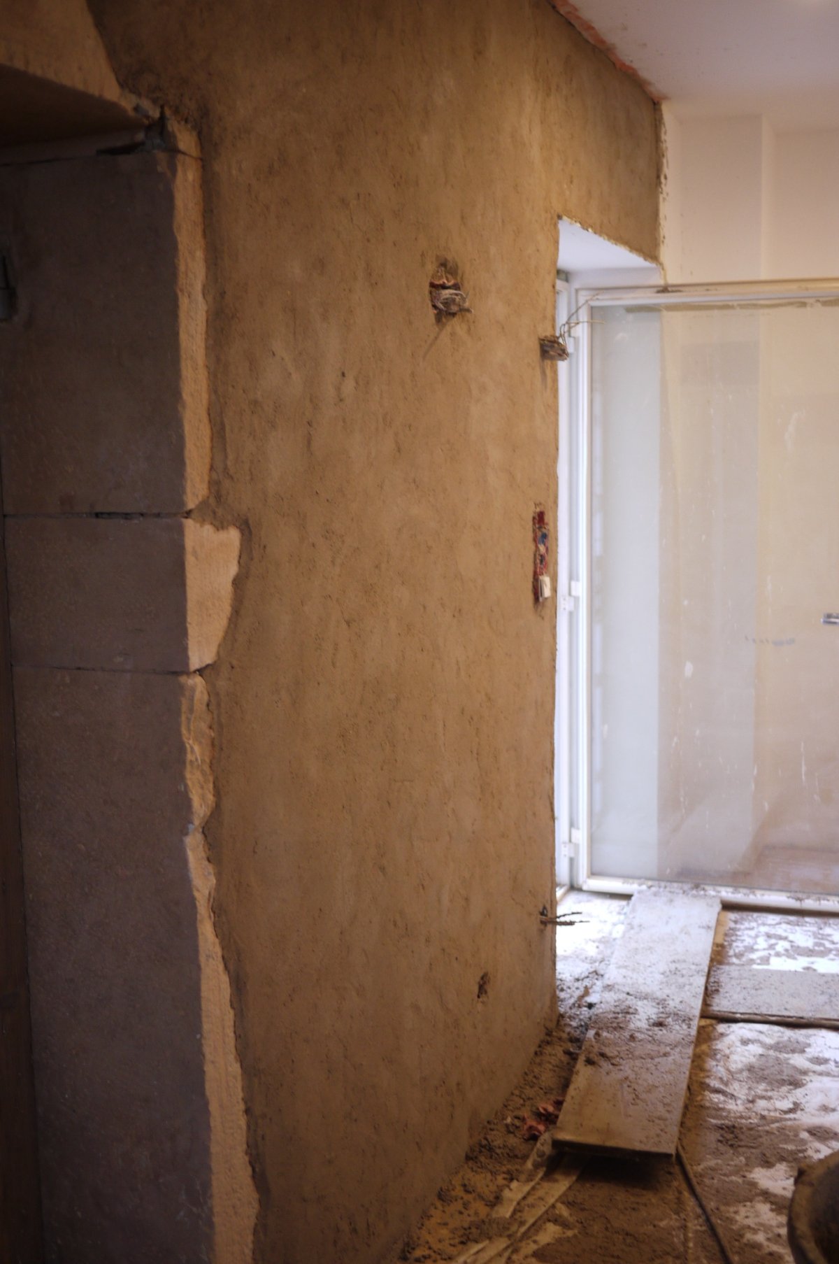 Nous voici dans une pièce destinée à devenir un coin cuisine - salon - salle à manger. La pièce ne dispose que d'une fenêtre orienté Nord-Est pour laissé entrer la lumière. L'enjeu était donc d'apporter un maximum de lumière à cette pièce. Un vieil enduit de chaux, recouvert de plâtre, prêt à tomber recouvrait ce pan du mur. Ici l'apport de lumière était plus important que de conserver les pierres apparente, et il aurait été dommage de recouvrir les encadrements de porte avec un doublage placo. On opta donc pour un enduit blanc à la chaux.