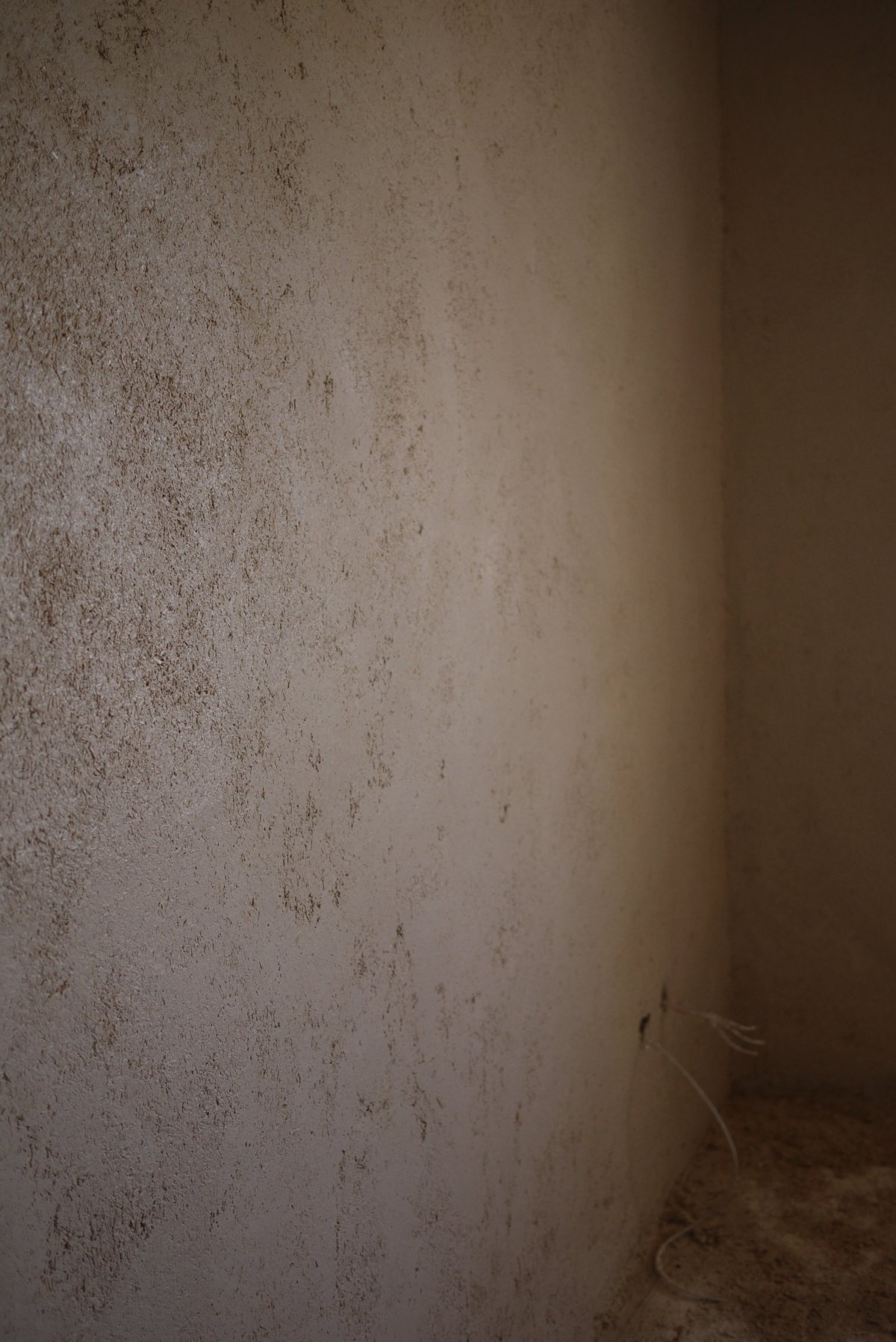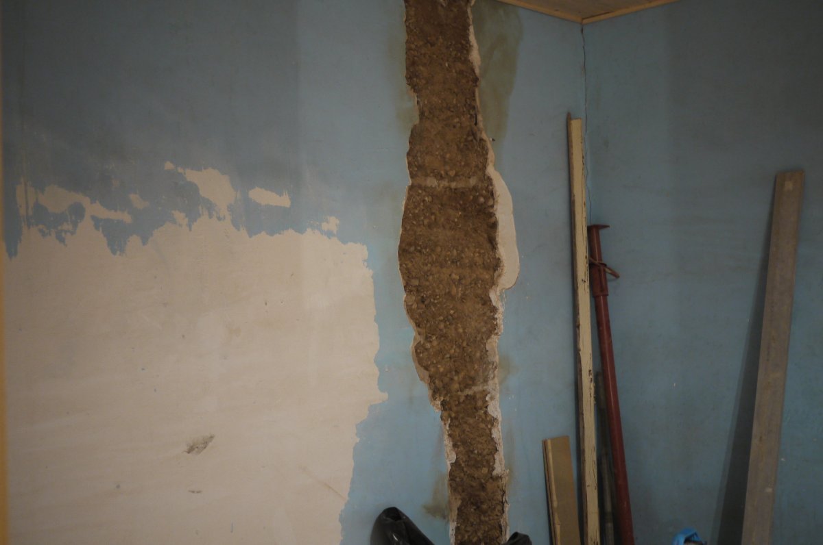 Il peut y avoir des retouches préalable à effectuer avant l'application de l'enduit, ici quelques trous à reboucher et une fissure dans un angle de mur. L'enduit de bouchage peut se composer de terre à pisé adjuvanté avec une part de chaux et quelques fibres.