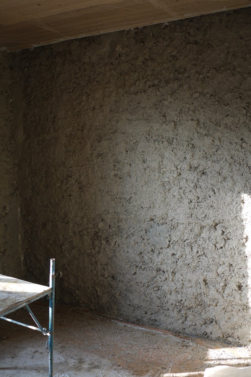 La première couche de chaux - chanvre, le corps d'enduit, qui dresse la surface et corrige des différences de planéité du mur.