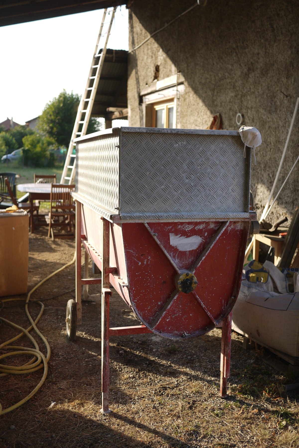Au niveau matériel il nous faut une grosse bétonnière ou un malaxeur à chanvre. Ici la "grosse berta" nous à servi à faire la préparation.