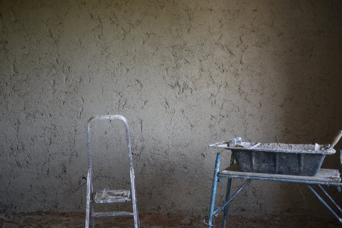 Dressage de l'enduit de finition, l'application se fait à la taloche ce qui permet de poser l'enduit et de dresser en une seule étape.